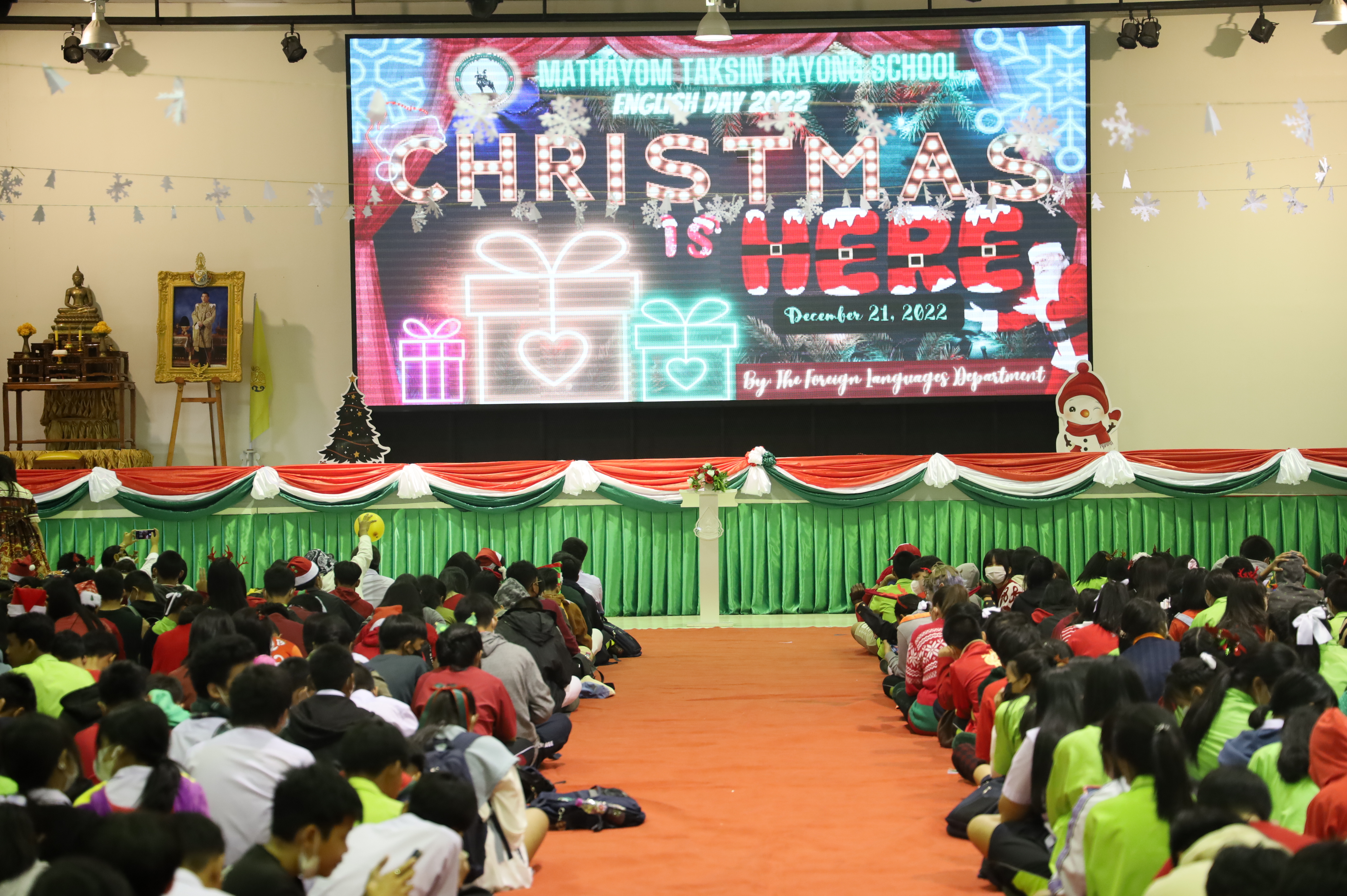 กลุ่มสาระการเรียนรู้ภาษาต่างประเทศ โรงเรียนมัธยมตากสินระยอง ได้ดำเนินการจัดกิจกรรมโครงการส่งเสริมการเรียนรู้วัฒนธรรมต่างประเทศ (กิจกรรมวันคริสต์มาส) ประจำปี 2565 ในวันที่ 21 ธันวาคม พ.ศ. 2565 ตั้งแต่เวลา 9.00 - 17.00 น. ณ หอประชุมชั้น 3 อาคารอเนกประสงค์ โดยมีนางสาววัชราภรณ์ สมพงษ์ผึ้ง รองผู้อำนวยการสถานศึกษา โรงเรียนอนุบาลนานาชาติตากสินระยอง รักษาการในตำแหน่ง ผู้อำนวยการสถานศึกษา โรงเรียนมัธยมตากสินระยอง พร้อมด้วยคณะผู้บริหาร อาจารย์ผู้เชี่ยวชาญ คณะครูและนักเรียนเข้าร่วมกิจกรรม เพื่อให้นักเรียนได้ทราบประวัติความเป็นมาของวันคริสต์มาส เปิดโอกาสให้นักเรียนได้สนุกสนานรื่นเริงและเพื่อสร้างความสัมพันธ์ระหว่างผู้ปกครองกับครู ซึ่งภายในงานมีกิจกรรมมากมาย ไม่ว่าจะเป็นการแสดงละครเกี่ยวกับวันคริสต์มาส, การแสดงจากคณะครูต่างชาติ, กิจกรรมตอบคำถาม การประกวดร้องเพลงสากล, การประกวด Mr. & Ms. Christmas Day, การแสดง Folk songs จาก MTRS Brands และการประกวดเต้น Cover Dance