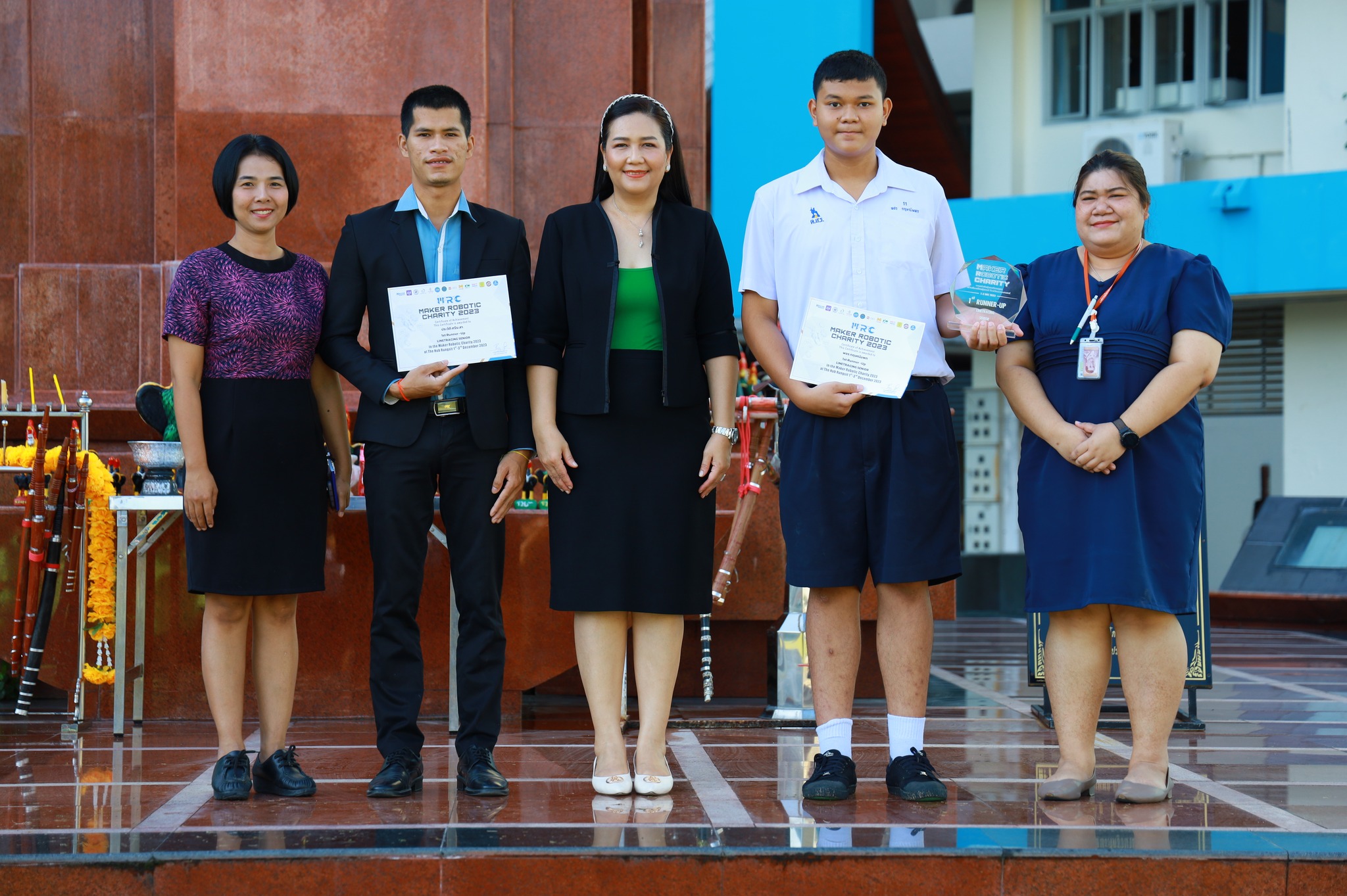 นางสาววัชราภรณ์ สมพงษ์ผึ้ง รองผู้อำนวยการสถานศึกษา โรงเรียนอนุบาลนานาชาติตากสินระยอง รักษาการในตำแหน่ง ผู้อำนวยการสถานศึกษา โรงเรียนมัธยมตากสินระยอง มอบใบประกาศนียบัตรให้กับนักเรียนที่ได้รับรางวัล ในวันที่ 6 ธันวาคม 2566 ณ ลานสมเด็จพระเจ้าตากสิน ในการแข่งแข่งขันหุ่นยนต์ “MAKER ROBOTIC CHARITY” ในรายการ Linetracing รุ่น Junior และ Senior ระหว่างวันที่ 1-3 ธันวาคม 2566 ณ ศูนย์การค้า เดอะฮับ รังสิต ตำบลคูคต อำเภอลำลูกกา จังหวัดปทุมธานี โดยมีครูประวัติ ศรีระสา เป็นผู้ฝึกซ้อม