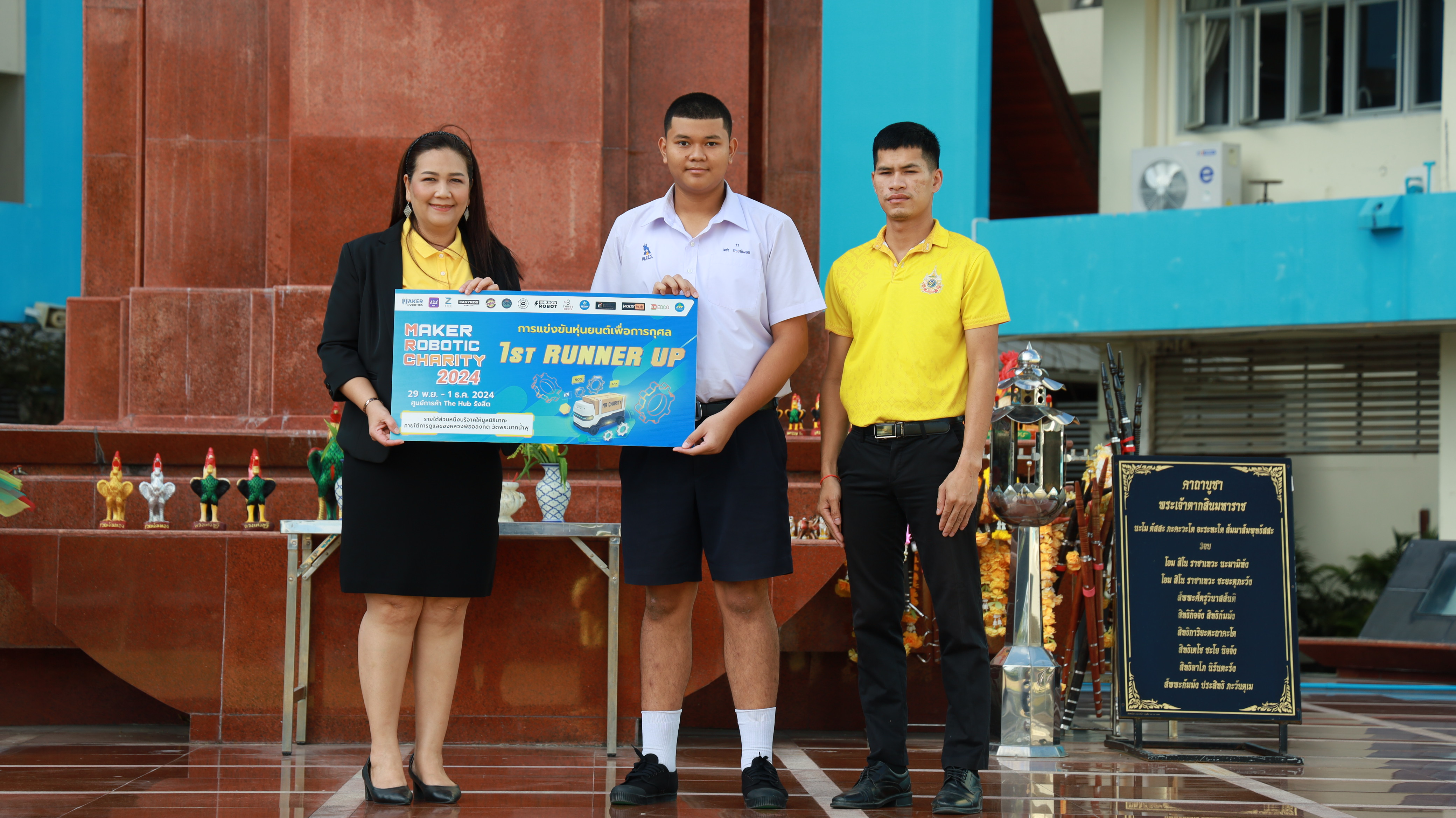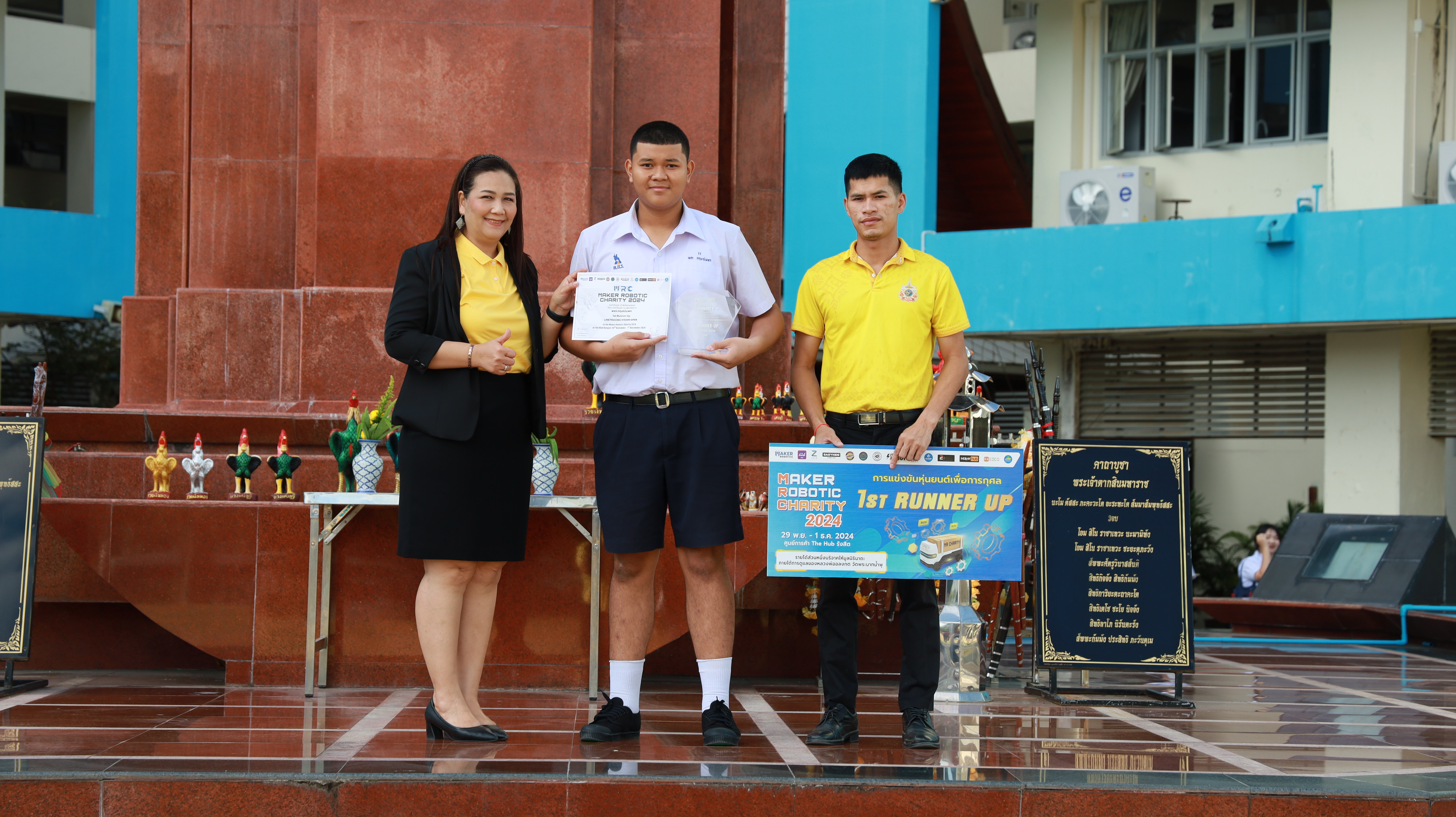 นางสาววัชราภรณ์ สมพงษ์ผึ้ง รองผู้อำนวยการสถานศึกษา โรงเรียนอนุบาลนานาชาติตากสินระยอง รักษาการในตำแหน่ง ผู้อำนวยการสถานศึกษา โรงเรียนมัธยมตากสินระยอง ร่วมแสดงความยินดีให้เกียรติมอบรางวัลและเป็นกำลังใจให้กับครูและนักเรียนที่สร้างชื่อเสียง ในวันที่ 16 ธันวาคม 2567 ณ ลานสมเด็จพระเจ้าตากสินมหาราช ในการแข่งขันหุ่นยนต์ในงาน Maker Robotic Charity 2024 ระหว่างวันที่ 29 - 1 พฤศจิกายน 2567 เพื่อการกุศลและคัดเลือกตัวเเทนไปเข้าร่วมแข่งต่อที่ต่างประเทศ โรงเรียนมัธยมตากสินระยองเข้าร่วมแข่งขันในรายการ : Line Tracing Vision Open ได้รับรางวัล : 1st Runner Up โดยมีสิบเอกประวัติ ศรีระสา เป็นครูผู้ฝึกซ้อม