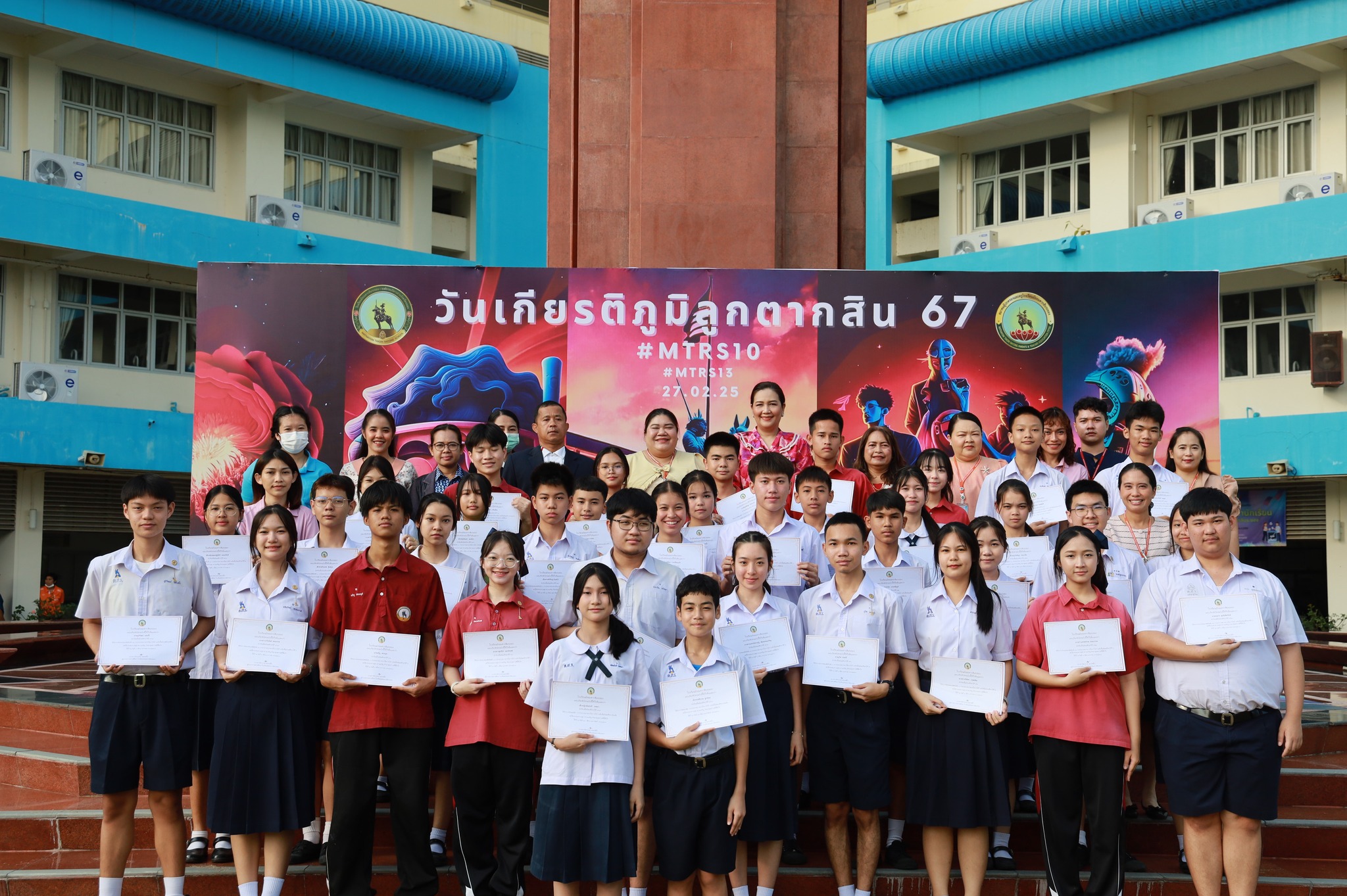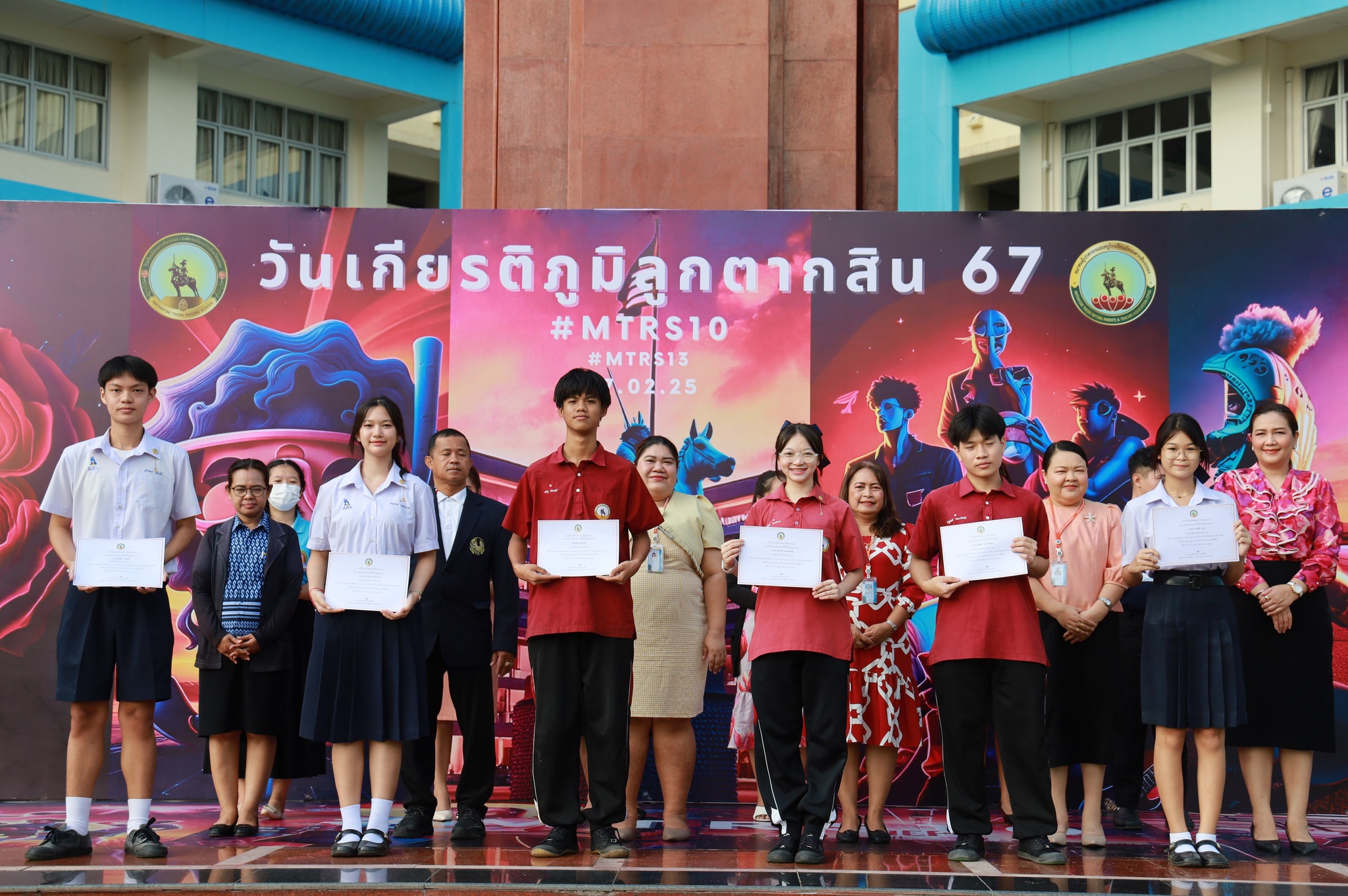 นางสาววัชราภรณ์ สมพงษ์ผึ้ง ผู้อำนวยการสถานศึกษา โรงเรียนมัธยมตากสินระยอง ร่วมแสดงความยินดีกับนักเรียน ในวันที่ 6 มีนาคม 2568 ณ ลานสมเด็จพระเจ้าตากสินมหาราช ที่เข้าร่วมการแข่งขันการประกวดมารยาทไทย (การไหว้) ระดับโรงเรียนมัธยมตากสินระยอง องค์การบริหารส่วนจังหวัดระยอง ในวันที่ 18 กุมภาพันธ์ 2568ที่ผ่านมา ฝึกซ้อมโดย นางสาวสุธาสินี นรินทร์ และนางสาวสายฝน จักมา (ครูผู้ฝึกซ้อม)