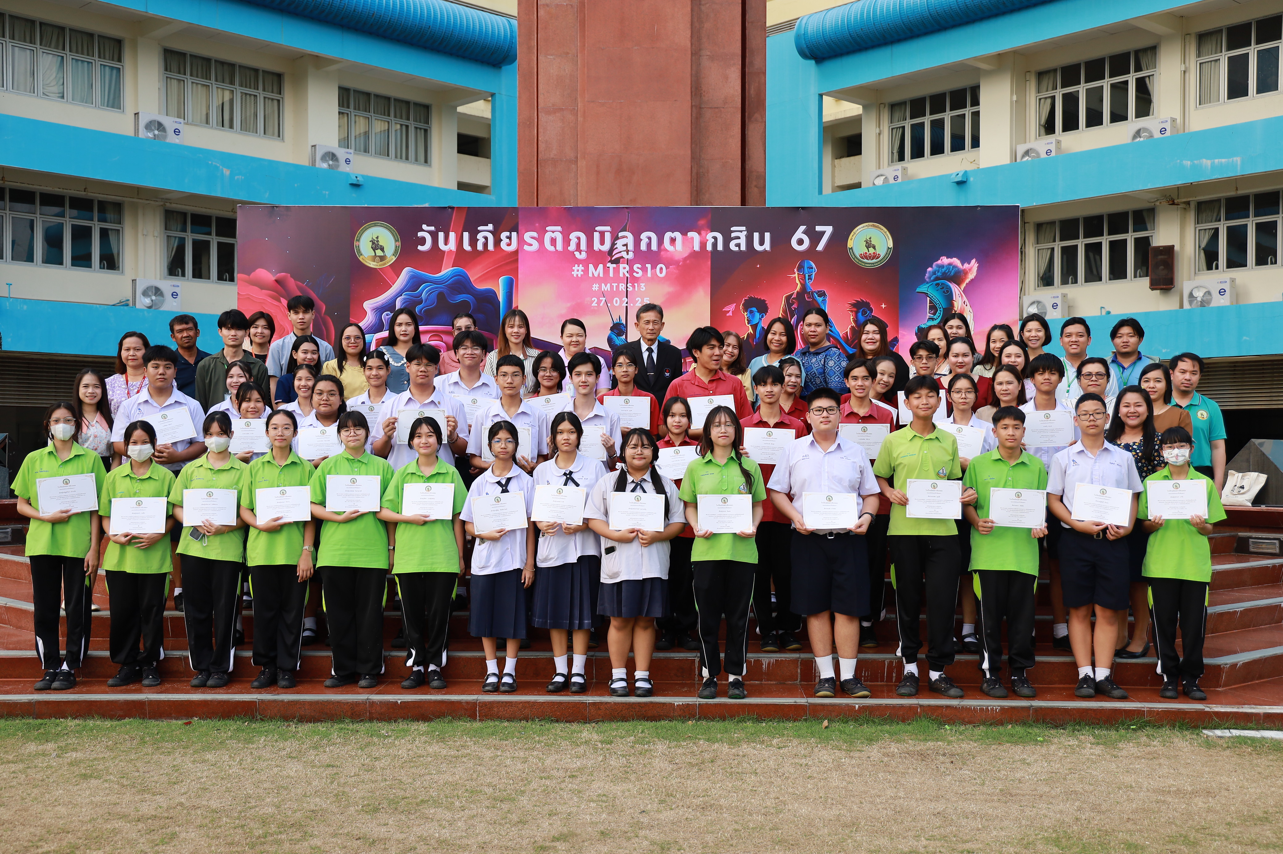 ดร.สุกิจ โพธิ์ศิริกุล ผู้เชี่ยวชาญด้านการบริหารงานวิชาการด้านมัธยม, นางศศิธร นารินนท์ รองผู้อำนวยการสถานศึกษา โรงเรียนมัธยมตากสินระยอง และนางณัฏฐพัชร์ ธีระชลาลัย ครู วิทยฐานะครูชำนาญการ รักษาการในตำแหน่ง รองผู้อำนวยการสถานศึกษา กลุ่มงานบริการ ร่วมแสดงความยินดีกับนักเรียน ในวันที่ 6 มีนาคม 2568 ณ ลานสมเด็จพระเจ้าตากสินมหาราช ที่ได้รับรางวัลจากการแข่งขันโครงงานคณิตศาสตร์ ระดับชั้นมัธยมศึกษาตอนต้นและตอนปลายเนื่องในกิจกรรม "โครงการพัฒนาผู้เรียนด้านอัจฉริยภาพทางคณิตศาสตร์" ประจำปีการศึกษา 2567