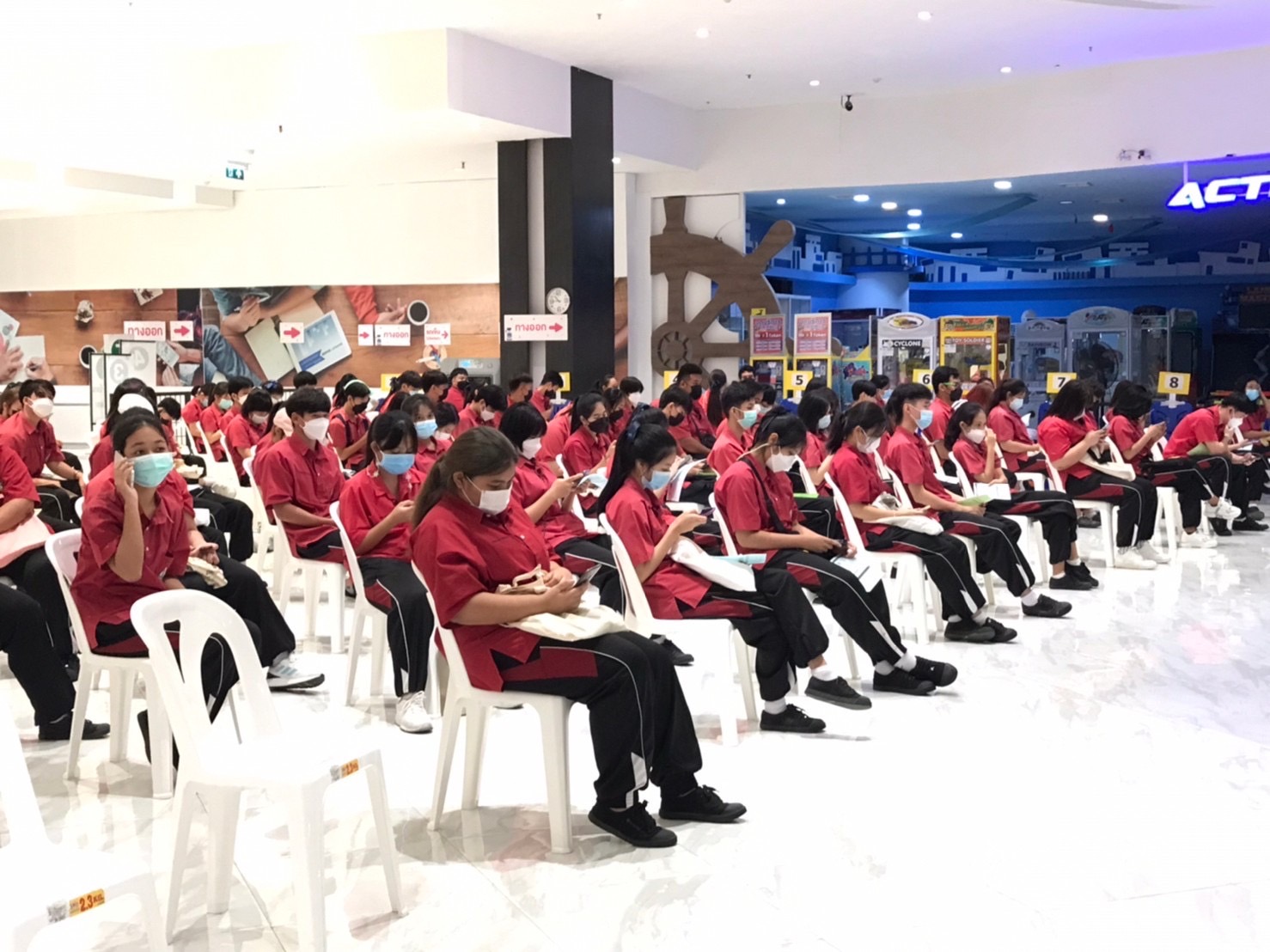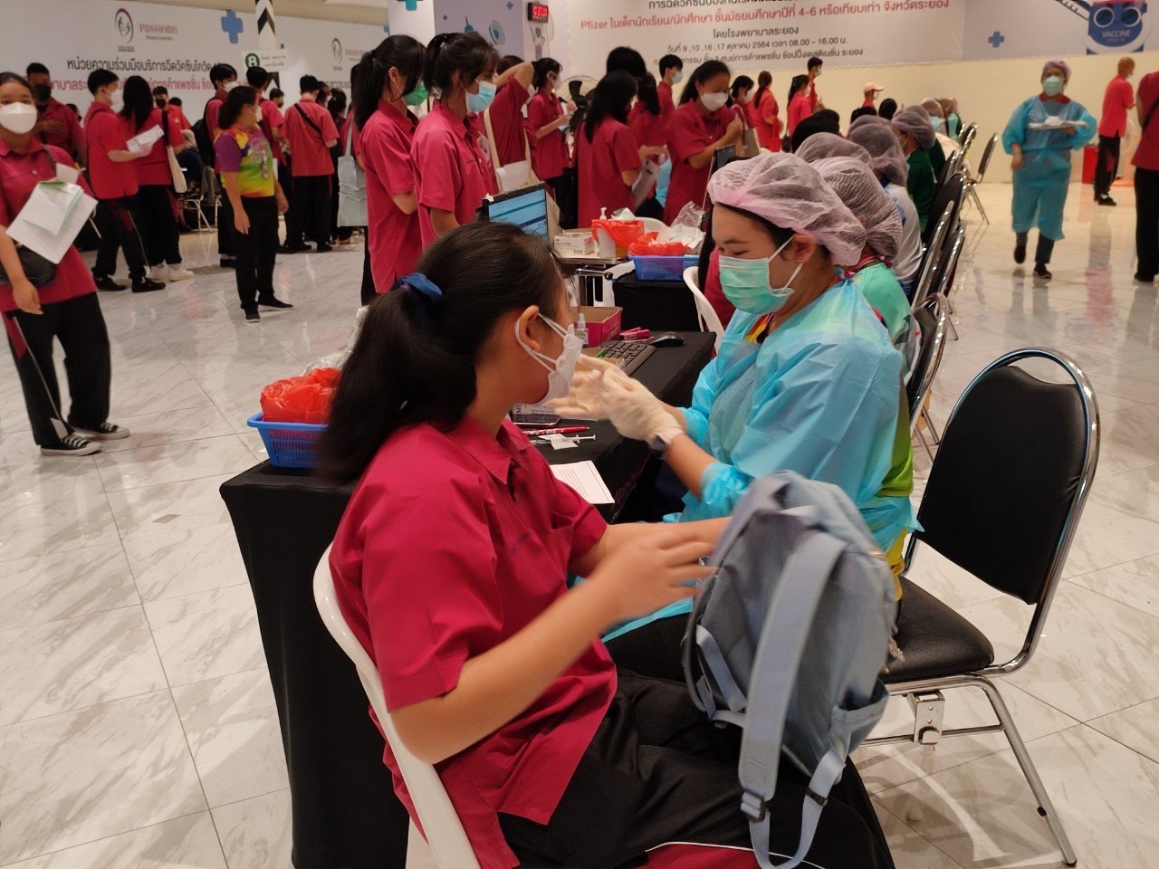 นักเรียนโรงเรียนมัธยมตากสินระยองในระดับชั้นมัธยมศึกษาตอนปลาย ที่มีความประสงค์รับวัคซีน COVID-19 (Pfizer) ได้เข้ารับการฉีดวัคซีน ในวันที่ 17 ตุลาคม 2564 เวลา 8.00 -12.00 น. ณ ศูนย์การค้าแพชชั่นฯ จังหวัดระยอง โดยได้รับการดูแลเอาใจใส่จากเจ้าหน้าที่โรงพยาบาลระยองทุกท่านและทุกฝ่ายเป็นอย่างดียิ่ง