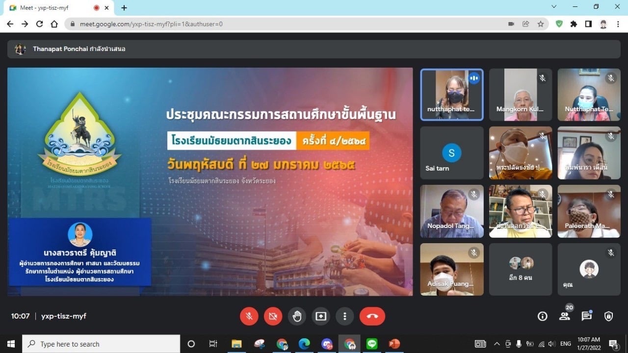 โรงเรียนมัธยมตากสินระยอง ได้มีการประชุมคณะกรรมการสถานศึกษาขั้นพื้นฐาน โรงเรียนมัธยมตากสินระยอง ครั้งที่ 4/2565 ผ่านระบบออนไลน์ แอพพลิเคชั่น Google Meet ในวันที่ 27 มกราคม พ.ศ. 2565 โดยมีนายมังกร กุลวานิช ประธานคณะกรรมการสถานศึกษาขั้นพื้นฐานโรงเรียนมัธยมตากสินระยอง พร้อมด้วยคณะกรรมการสถานศึกษาขั้นพื้นฐานโรงเรียนมัธยมตากสินระยอง, นางสาวราตรี คุ้มญาติ ผู้อำนวยการกองการศึกษา ศาสนา และวัฒนธรรม รักษาการในตำแหน่งผู้อำนวยการสถานศึกษา โรงเรียนมัธยมตากสินระยอง, นางสาวปาลีรัฐ มานะเลิศ รองผู้อำนวยการสถานศึกษาฯ, คณะผู้เชี่ยวชาญ, สมาคมผู้ปกครองและคณะครูที่เกี่ยวข้อง ได้เข้าร่วมการประชุมในครั้งนี้ โดยได้ดำเนินการรายงานและหารือตามวาระการประชุม เพื่อให้ที่ประชุมได้รับทราบ ระดมความคิดเห็นของคณะกรรมการสถานศึกษาขั้นพื้นฐาน ได้ร่วมกันอภิปราย สรุป ตลอดจนเสนอแนะแนวทางแก้ไขปัญหาต่าง ๆ เพื่อนำข้อมูลไปใช้ในการร่วมพัฒนาสถานศึกษาต่อไป