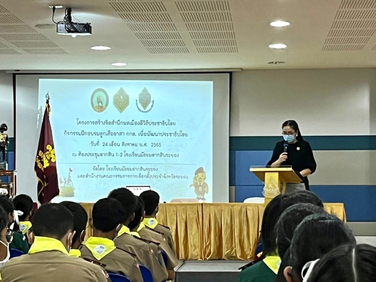 นางสาววัชราภรณ์ สมพงษ์ผึ้ง รองผู้อำนวยการสถานศึกษา โรงเรียนอนุบาลนานาชาติตากสินระยอง รักษาการในตำแหน่ง ผู้อำนวยการสถานศึกษา โรงเรียนมัธยมตากสินระยอง พร้อมด้วยคณะครู และนักเรียน ได้เข้าร่วมกับ สำนักงานคณะกรรมการการเลือกตั้งจังหวัดระยอง ดำเนินโครงการสร้างจิตสำนึกพลเมืองดี วิถีประชาธิปไตย กิจกรรมฝึกอบรมและจัดตั้งหน่วยลูกเสืออาสา กกต. ในวันที่ 24 สิงหาคม 2565 ณ ห้องประชุมมูลนิธิตากสิน 2-3 โดยมีวัตถุประสงค์เพื่อให้ลูกเสืออาสา กกต. มีความรู้และความเข้าใจที่ถูกต้อง เกี่ยวกับการปกครองระบอบประชาธิปไตยอันมีประมหากษัตริย์ทรงเป็นประมุข และปฏิบัติหน้าที่ลูกเสืออาสา กกต. เพื่อให้พัฒนาประชาธิปไตย ของโรงเรียนมัธยมตากสินระยอง