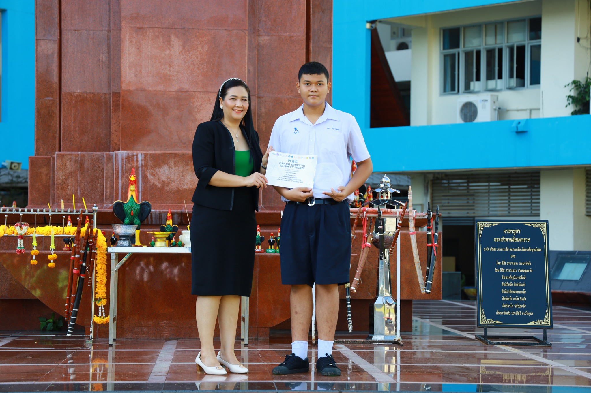 นางสาววัชราภรณ์ สมพงษ์ผึ้ง รองผู้อำนวยการสถานศึกษา โรงเรียนอนุบาลนานาชาติตากสินระยอง รักษาการในตำแหน่ง ผู้อำนวยการสถานศึกษา โรงเรียนมัธยมตากสินระยอง มอบใบประกาศนียบัตรให้กับนักเรียนที่ได้รับรางวัล ในวันที่ 6 ธันวาคม 2566 ณ ลานสมเด็จพระเจ้าตากสิน ในการแข่งแข่งขันหุ่นยนต์ “MAKER ROBOTIC CHARITY” ในรายการ Linetracing รุ่น Junior และ Senior ระหว่างวันที่ 1-3 ธันวาคม 2566 ณ ศูนย์การค้า เดอะฮับ รังสิต ตำบลคูคต อำเภอลำลูกกา จังหวัดปทุมธานี โดยมีครูประวัติ ศรีระสา เป็นผู้ฝึกซ้อม