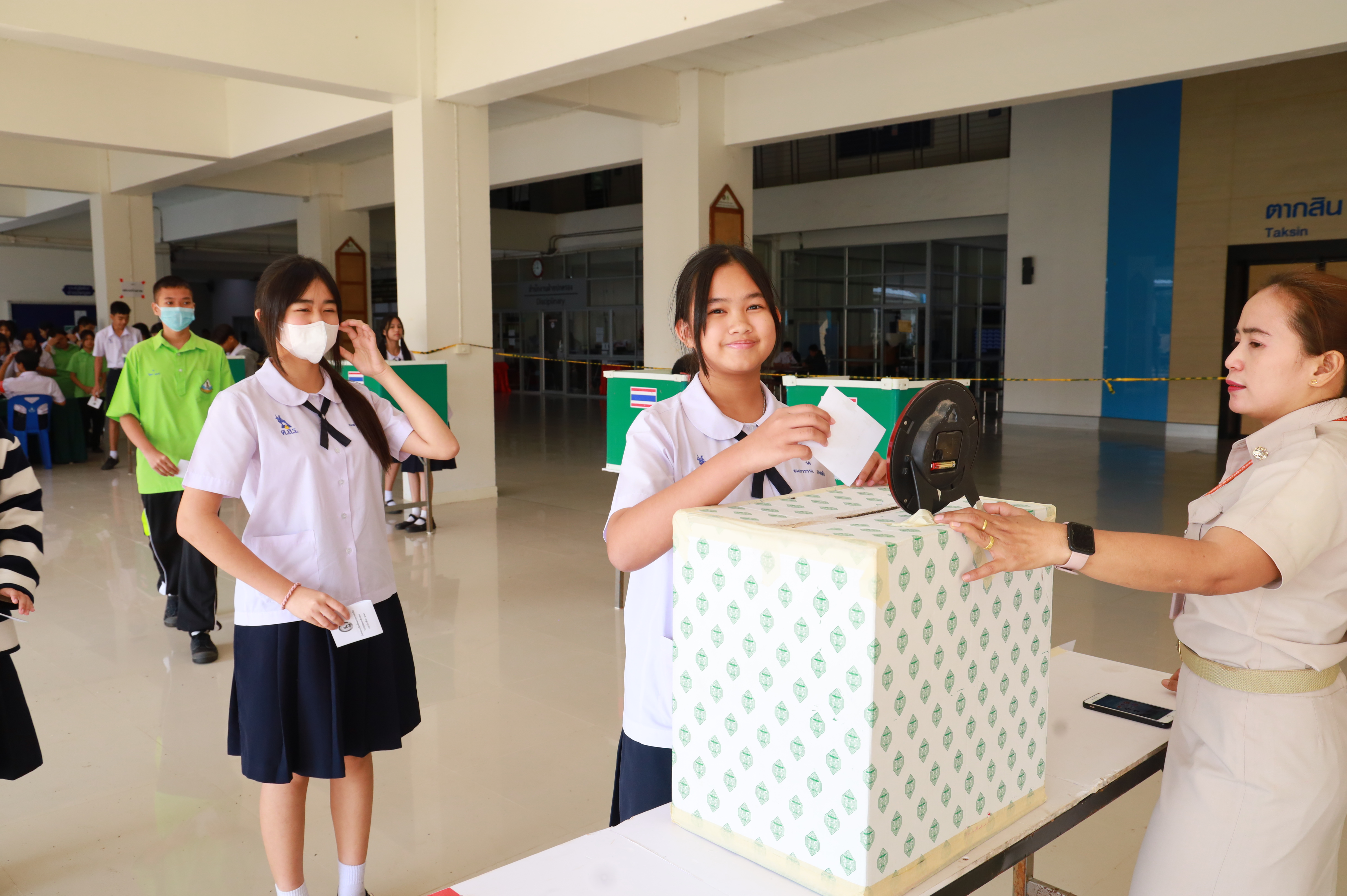 คณะครูงานคณะกรรมการนักเรียน ได้ดำเนินงานเลือกตั้งประธานนักเรียน ประจำปีการศึกษา 2567 ในวันที่ 12 กุมภาพันธ์ 2567 เวลา 08:30 น. ณ หน้าห้องกิจกรรมนักเรียน โดยมีนางสาววัชราภรณ์ สมพงษ์ผึ้ง รองผู้อำนวยการสถานศึกษา โรงเรียนอนุบาลนานาชาติตากสินระยอง รักษาการในตำแหน่ง ผู้อำนวยการสถานศึกษา โรงเรียนมัธยมตากสินระยอง เปิดกล่องเลือกตั้งประธานนักเรียน ประจำปีการศึกษา 2567 เพื่อแสดงความโปร่งใส ซึ่งเป็นกิจกรรมส่งเสริมประชาธิปไตยในโรงเรียน เพื่อให้นักเรียนได้ตระหนักถึงความสำคัญของระบอบประชาธิปไตยและนักเรียนได้เรียนรู้วิธีการเลือกตั้งและการยอมรับในนโยบายและคะแนนเสียงของนักเรียนในโรงเรียน ที่ได้เลือกประธานนักเรียน