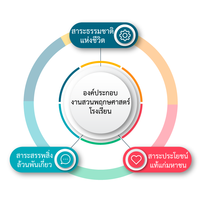 งานสวนพฤกษศาสตร์โรงเรียน - พืชศึกษา - องค์ประกอบงานสวนพฤกษศาสตร์โรงเรียน องค์ประกอบที่ 1 องค์ประกอบที่ 2 องค์ประกอบที่ 3 องค์ประกอบที่ 4 องค์ประกอบที่ 5 - ธรรมชาติแห่งชีวิต - สรรพสิ่งล้วนพันเกี่ยว - ประโยชน์แท้แก่มหาชน - สำราจและจัดทำฐานทรัพยากรท้องถิ่น |
