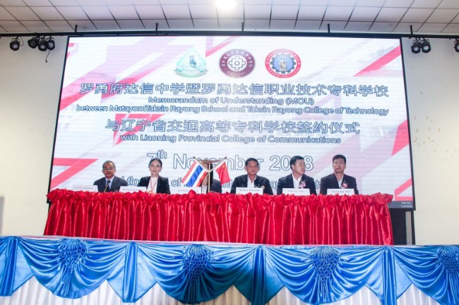 ในวันที่ 7 พฤศจิกายน 2561 นายปิยะ ปิตุเตชะ นายกองค์การบริหารส่วนจังหวัดระยอง พร้อมด้วย นางสาวราตรี คุ้มญาติ ผู้อำนวยการกองการศึกษาศาสนาและวัฒนธรรม องค์การบริหารส่วนจังหวัดระยอง นางสาวภรณ์ภัทร์ธัญ งามวงศ์เงิน ผู้อำนวยการสถานศึกษาโรงเรียนมัธยมตากสินระยอง คณะครู และนักเรียนโรงเรียนมัธยมตากสินระยอง และวิทยาลัยเทคโนโลยีอาชีวศึกษาตากสินระยอง ร่วมให้การต้อนรับ และพิธีลงนามบันทึกข้อตกลงความร่วมมือ(MOU) ระหว่างโรงเรียนมัธยมตากสินระยองและวิทยาลัยเทคโนโลยีอาชีวศึกษาตากสินระยองกับวิทยาลัยการคมนาคมเหลียวหนิง ประเทศจีน โดยมีวัตถุประสงค์เพื่อแลกเปลี่ยนเรียนรู้ ซึ่งกันและกัน และนำระบบการเรียนการสอนมาช่วยพัฒนาหลักสูตรเพื่อให้เกิดประสิทธิภาพยิ่งขึ้นต่อไป